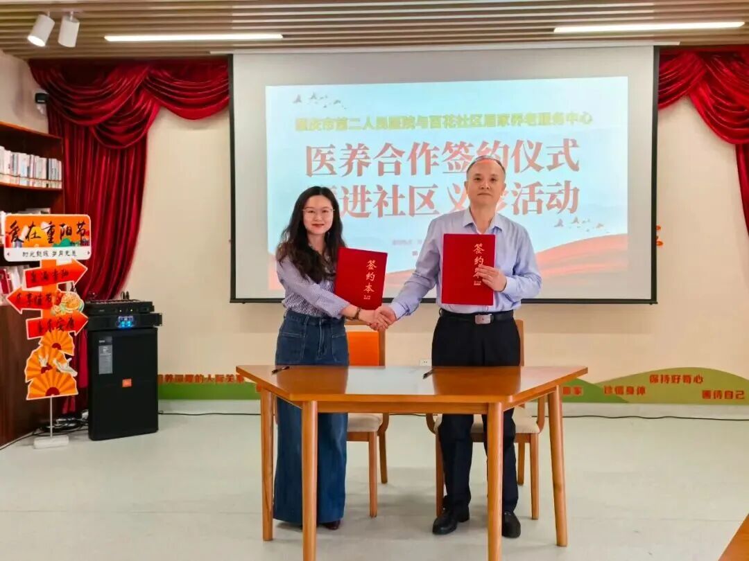 活动伊始,百花社区居家养老服务中心与肇庆市第二人民医院共同举行了隆重的医养结合合作签约暨揭牌仪式。